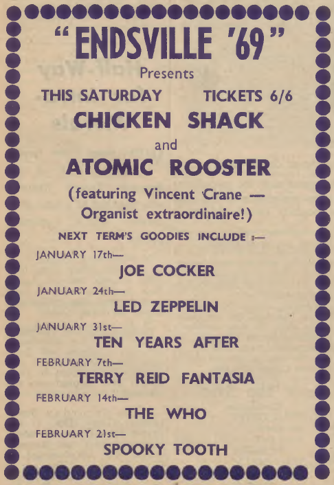 ”Chris and Vic” of the University News (January 30, 1970): “Their ‘two hour’ hop at the Union took nearly three hours. The fact that there were six encores only emphasizes their terrific performance. The refectory was a mass of people captivated by the sounds put out by the incredible Led Zeppelin.”
